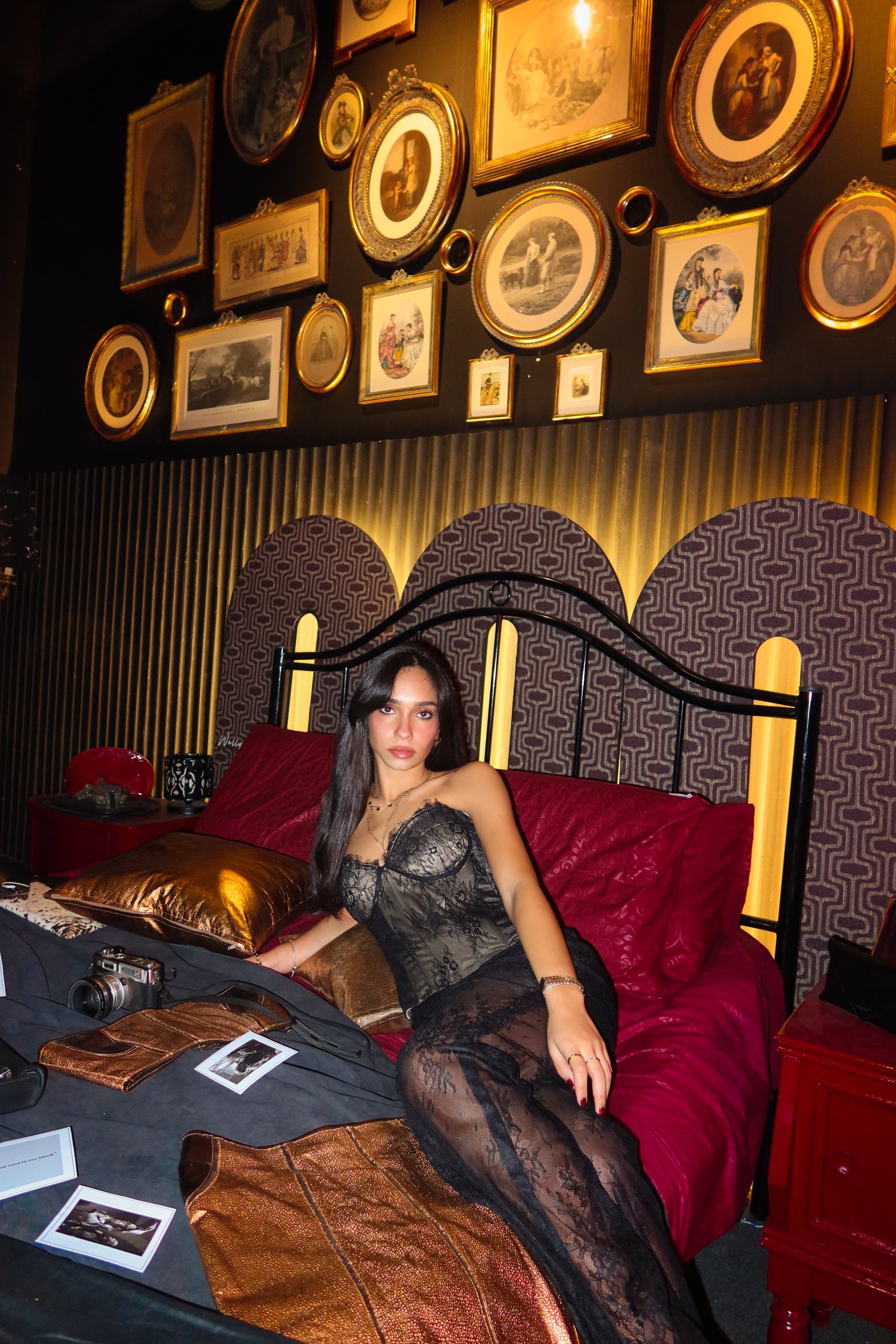 The Celeste Corset blends delicate Dantelle elegance with subtle structure, creating a soft yet defined silhouette. Its romantic details elevate any night-out look while maintaining an effortless feel.